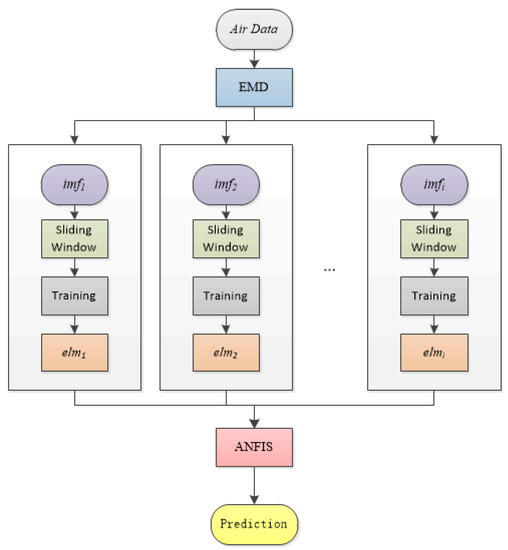 The forecast flow chart of the empirical-mode-decomposition-based fuzzy prediction model (EMD-FPM) is shown in Algorithm 1. The EMD-FPM decomposes the concentration of air pollutants to obtain the variation trend of the concentration of air pollutants in different time scales, which is the IMF. Then, the IMF is trained with ELM, and the ANFIS is used to fit the training results to obtain the final prediction value. The structure diagram is shown in Figure 6.