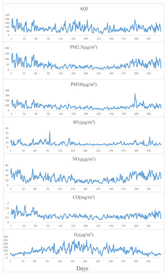 The data came from a data center of the China Ministry of Ecology and Environment (http://datacenter.mee.gov.cn, accessed on 5 February 2021), collected by day. The data provided by the monitoring stations are AQI, PM, PM, sulfur dioxide (SO), nitrogen dioxide (NO), carbon monoxide(CO), and ozone (O), of which the measurement unit of PM, PM, SO, NO, and O is (µg/m), while CO is measured in (mg/m). The data are shown in Figure 2. The detection time of SO, NO, CO, and O is measured in hours, while PM and PM are the average concentrations during a 24 h period. For the convenience of the statistics and research, all main pollutants are expressed in 24 h average concentrations in this paper. The data are highly accurate and scientific, which is of great significance to the algorithm prediction experiment.