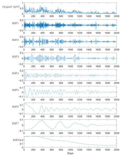 - Huang, N.E.; Shen, Z.; Long, S.R.; Wu, M.C.; Shih, H.H.; Zheng, Q.; Yen, N.C.; Tung, C.C.; Liu, H.H. The empirical mode decomposition and the Hilbert spectrum for nonlinear and non-stationary time series analysis. Proc. Math. Phys. Eng. Sci. 1998, 454, 903–995. [Google Scholar] [CrossRef]