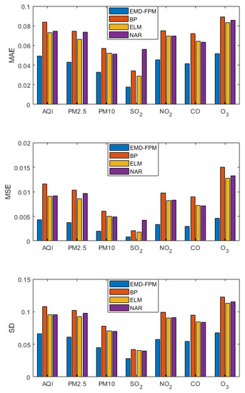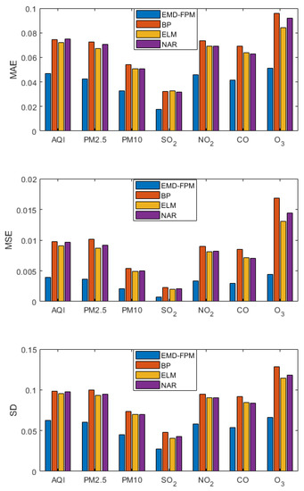 A short-term prediction was made for each index of air quality. That is, the data of the top six days were used to predict the value of the seventh day, and the prediction results are shown in Figure 9. As can be seen from the figure, the BP neural network, ELM, and the NAR neural network have similar performances. These three neural networks only calculate the predicted value of air quality and fail to fully explore the internal relationship of air quality, so the performances are close. ELM has the best effect, and the error range of the three indicators is small. This is because ELM performs better when the data volume is small. The EMD-FPM has good accuracy and generalization performance in the prediction of the Air Quality Index or air pollutants, which is about 30% higher than other algorithms. All three evaluation indexes are superior to the other algorithms, which means that the EMD-FPM algorithm not only has high accuracy, but also has good adaptability to special situations.