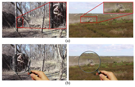 Schematic diagram of the observation of a camouflaged soldier and tank with a magnifier. (a) Camouflaged objects; (b) Observe camouflage objects with a magnifier.