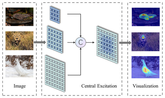 The connection of three sets of DConvs can increase the importance of the central features while increasing the receptive field, thus achieving a central excitation of the input. The visualization of the feature map output from the CEM is shown on the right in Figure 5.