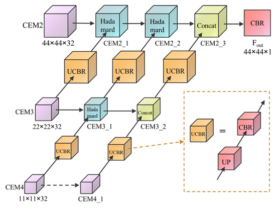 The function of the MFFM is to fully integrate the feature maps after central excitation of different scales, thereby outputting a camouflaged object map that contains abundant high- and low-level features. The MFFM structure diagram is shown in Figure 6. The small-scale excitation feature map transmits the feature information to the large-scale feature map through continuous upsampling and fusion and then generates an output feature map with a size of 44 × 44 × 1.