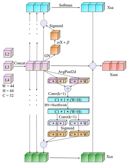 where denotes the concatenation operation along the spatial dimension, denotes the 1 × 1 convolution with C1 convolution kernels, and denotes BatchNorm and HardSwish operations on feature maps. The fused feature maps were sliced and encoded into two attention maps storing location information.