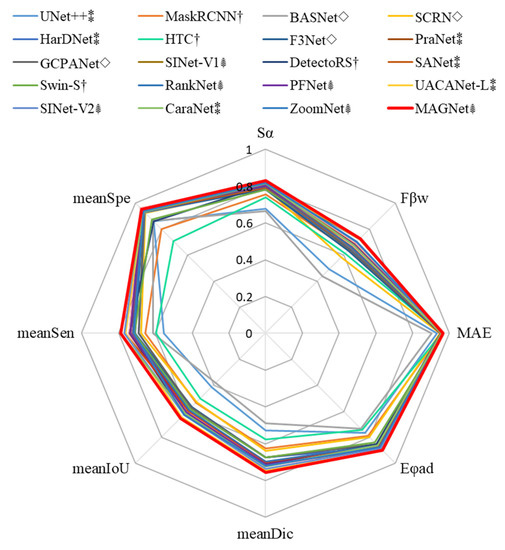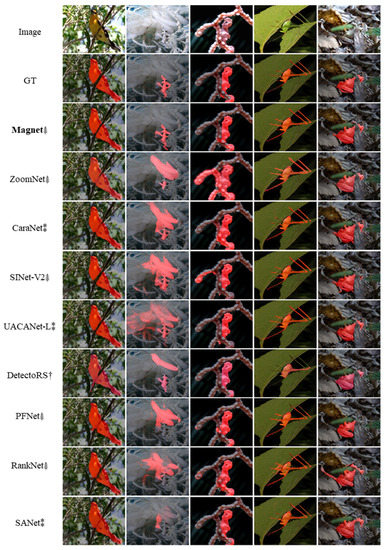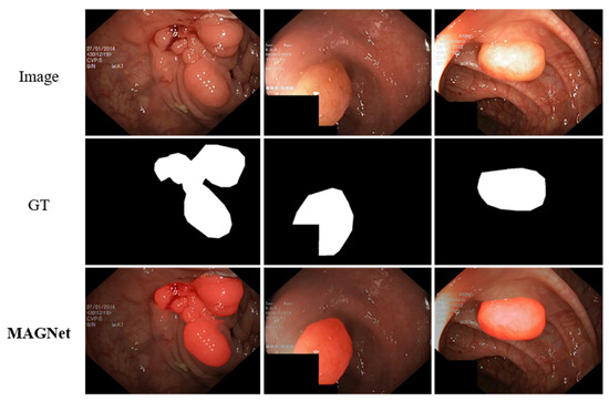 From the comparison with the latest methods in Section 4.2, we find that the results of several saliency object detection algorithms are unsatisfactory, which proves that it is not reasonable to apply saliency object detection algorithms to the detection of camouflaged objects. COD methods and medical image segmentation methods accounted for 96% (23/24) of the top three values of the eight metrics. The results show that medical image segmentation methods can achieve better results in camouflaged object segmentation tasks because some medical image datasets (e.g., polyp datasets) have properties similar to those of camouflaged objects, i.e., inconspicuous edges and high integration with the surrounding environment [70,71,72]. Therefore, COD has a high potential application in the medical field. Figure 14 shows the visualization results of MAGNET applied to polyp detection, where the dataset used for the experiment is the Kvasir-SEG polyp dataset [70]. Table 7 shows the experimental comparison between the MAGNet method proposed in this paper and other medical image segmentation methods in the Kvasir-SEG polyp dataset. Here, we follow the experimental setup used in the literature [5]. The quantitative results of other algorithms are used from the original paper. It is worth noting that although MAGNet is not specifically designed for polyp detection; its performance is close to that of the best polyp-detection networks (where it achieves sub-optimal performance) and where it is evident that MAGNet has high potential for applications. When using migration learning coupled with model optimization for MAGNet, quantitative evaluation may be an even better option.