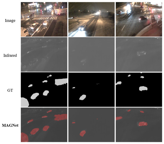 In addition, we explore other extended applications similar to COD. Figure 15 shows the visualization results applied for defect detection in industry, where the used dataset is the magnetic tile defect dataset [73]. Figure 16 shows the visualization results from applying MAGNET to infrared vehicle detection in rain and fog at night with the AAU-RainSnow dataset [74]. In these applications, similar to camouflaged objects, the object to be detected exhibits a high degree of fusion with the background, so the detection of camouflaged objects can be extended to similar applications.