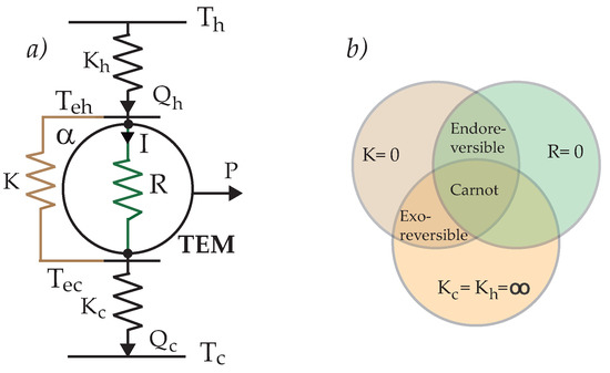 When it is considered that there is a reversible heat transfer between the TEM and the thermal sources and only internal irreversibilities are presented, there is a simple expression for its efficiency at maximum output power. This version of TEG operates between and temperatures (see Figure 1a), where the input and rejection heat flows are given by