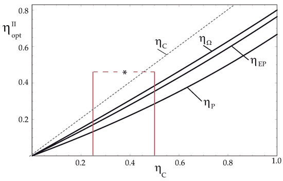 As can be seen, all the optimal values of the efficiencies are independent of value, that is, independent of the value of and . This result is also observed in conventional thermal engines, when considering that the heat transfer between the thermal sources and working substance follow a linear heating law [56]. The dissipation for this case is not presented, but it is straightforward to show that it fulfills the same behavior as in the exoreversible case, namely, .