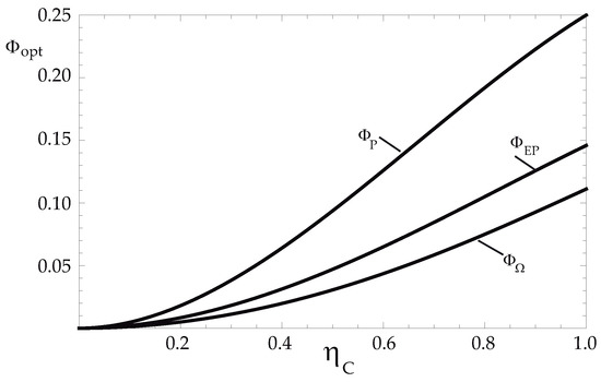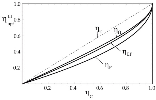 The behavior of these efficiencies is shown in Figure 4. As can be seen, the efficiency at maximum Omega function is always greater for all values of than those obtained in the regimes of maximum efficient power and maximum output power. That is