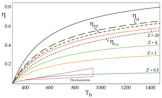 To conclude this section, Figure 5 is depicted, which shows the evolution of the efficiency of a TEG device (with all internal irreversibilities) with respect to the temperature of the hot source , considering the temperature of the cold source as K for different values as indicated. This figure completes the one presented by Shakouri [40] (Figure 2 therein), where only the efficiency at maximum power in the endoreversible limit is given. For comparison purposes, the three optimal efficiencies found for the endoreversible limit are included. As shown, both the efficiency at maximum Omega function and maximum efficient power are greater than those that could be achieved for the value of . The Carnot efficiency, , is also plotted. A small red triangle indicates the current range of operating temperatures and efficiencies for some TEG devices [47].