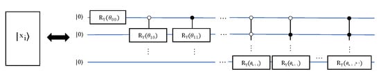 Many results in quantum information theory require the generation of specific quantum states, or the implementation of encoding a given vector onto qubits for computing, such as the quantum swap-test similarity calculation. However, many states cannot be efficiently realized. There are many methods focusing on the generation of quantum states, for example, Huelga et al. implemented an improved frequency standard experiment that requires the preparation of specific symmetric states on n qubits, where n is a parameter (number of ions) [38]. Kaye et al. proposed an algorithm, efficiently preparing the required symmetric state [39]. For any normalized vector , . We suppose that ; otherwise, the vector can be filled with 0. Long et al. proposed an algorithm for preparing arbitrary superposition quantum states with time complexity , space complexity and no additional auxiliary bits required [40]. The general method of encoding quantum states is shown in Figure 3.