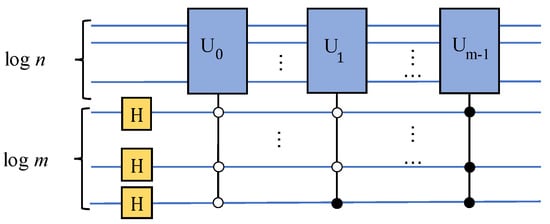 Repeating the previous steps according to the rule of dichotomy until all k-bit values are traversed, the circuit in Figure 3 can be obtained. In addition, for a vector set S of m elements, , where is a n-dimensional vector defined as before. Without loss of generality, we can set m is an integer power of 2, , thus an equal probability quantum superposition state , including labels about these vectors , ⋯, , can be constructed. The number of qubit is , and the circuit time complexity is , where the qubits are used as the label for state . The quantum circuit is shown in Figure 4. When the dimensions of the elements in S are inconsistent, the number of bits required is inconsistent. In this case, we take the number of bits required by the vector with the largest dimension as the number of bits for each circuit: