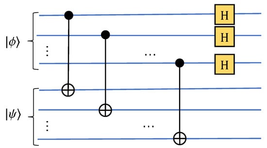 when the first register is and we can obtain the probability by measuring the labels and , i.e., similarity of . For the swap operation, it can be decomposed as three CNOT gates, thus the swap test can be represented as the gate set of Hadamard and CNOT. A simplified equivalent circuit for estimating the expectation value of the swap-test operation is proposed in [43], and the circuit employs one CNOT gate followed by one Hadamard gate, with both qubits being measured, which diagonalizes the swap gate, when it is treated as a Hermitian observable with eigenvalues 1 or −1 (Figure 6). The output distribution that constructs an estimator for tested states and is .