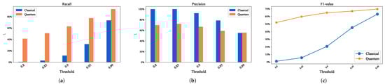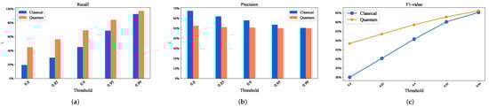 Obviously, the greater the number of misidentified points, the lower the accuracy. Thus, the quantum precision is slightly lower than classical precision, as shown in Figure 9b. Precision and recall are inherently contradictory; therefore, a comprehensive evaluation index F-score is required, which is the average of the weighted sum of precision and recall. When , it is called the F1-score.