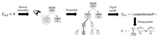 Scheme of the mechanism proposed for prospection and evaluation of updates during sequential decision making. Starting from no a priori payoffs for any option, the sensory information determines the region of the decision tree that is being prospected by the individual (option A in the example shown). Prospected paths (path deriving from option A that is emphasized) lead to a first update of the payoff given by the average payoff that would result from the paths prospected. These payoffs are then used to evaluate the cumulative Shannon entropy by using canonical probabilities (see the text for details).
