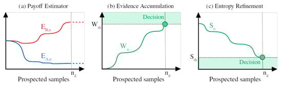 Scheme for the accumulator and reliability mechanisms. (a) Payoff estimation during successive prospected samples n. (b) Evolution of Wald’s ratio according to the payoff estimators (the decision is made at when reaches the threshold ). (c) Evolution of Shannon’s entropy according to the payoff estimators (the decision is made at when reaches the threshold ).