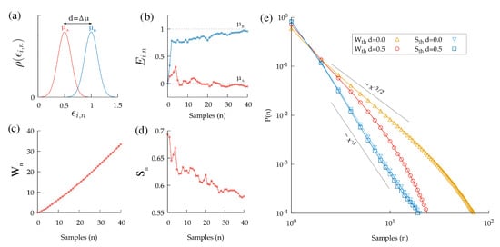 (a) Probability distributions for the stochastic variables (with n being the number of samples and where i labels the options A and B). The means , represent the actual payoffs for each option. (b) Evolution of the estimator as a function of the number of samples n. (c) Evolution of the cumulative with the number of samples n and with . (d) Evolution of the Shannon entropy with the number of samples n and with . (e) Probability distribution for the number of samples to reach or for the ERM and the SPRT, respectively, and for different distances . We simulated decisions to obtain these distributions. The thresholds were set to and .