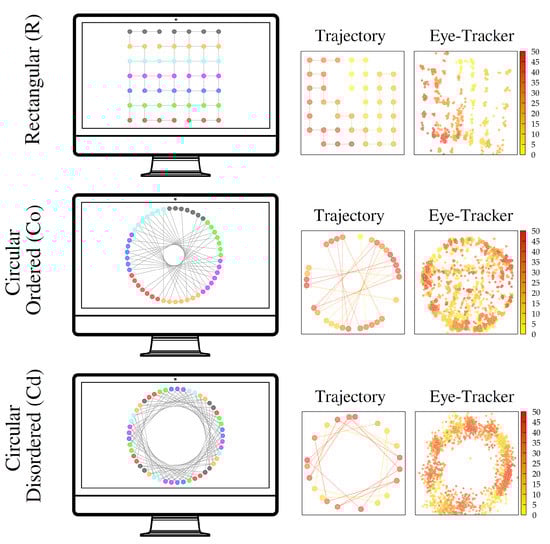 To assess the subjects’ performance under different levels of difficulty, the nodes in the rectangular lattice were then visually reorganized in a circular way. In one case (circular ordered), in the circle, we kept the order of the rows of the first rectangular graph (Figure 4, middle row). For the other (circular disordered), we placed the nodes according to a circular structure, but with random reorganization of nodes (Figure 4, lower row). We remark that, topologically, the three structures were completely identical, but visually different. Additionally, we rotated the rectangular structure by 90, 180, and 270 (with the corresponding circular-ordered and circular-disordered reorganizations) to randomize the task (so, 12 cases in total, all with the same topological structure, were presented to each subject). The final dataset then comprised 216 trajectories with a mean duration of s each.