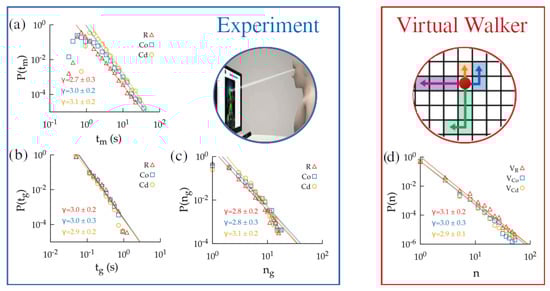 Distributions of time between consecutive moves (a), the time spent gazing at a given node (b), and the number of patches gathered between consecutive movements (c) obtained from the experimental data. (d) Distribution of the number of prospections n performed by a virtual random walker with . In all cases, the exponent obtained from a power-law fit to the distributions is highlighted, with the different colors representing the difficulty levels of R, CO, and CD.