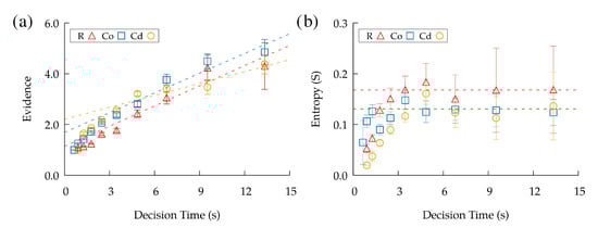 (a) Maximum relative evidence between the options at the moment of the decision. Linear fits (for times larger than 3 s) are given by (R), (CO), and (CD). (b) Shannon’s entropy at the moment of the decision. The horizontal lines correspond to the averaged entropy for times s ( (R), (CO), and (CD). A statistical test is given for the null hypothesis that the entropy was non-constant for times s. The corresponding p-values are (R), (CO), and (CD).