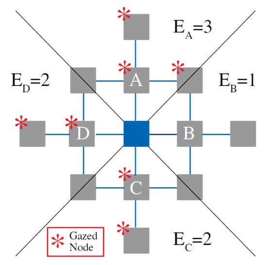 Using the square lattice as an example, at each time step, we divided the lattice into four equivalent regions starting from the current node (see Figure 8), so that each eye fixation that lay in a particular region would be assumed to contribute to the update of the payoff of the corresponding option (A, B, C, or D). If the individual, for example, was gazing for some time at the region corresponding to option A, then these samples were used to update the payoff according to the rule depicted in Figure 1. To do so, we generated a number of prospecting paths (of a given length ) proportional to the gazing time at random, and we computed the average number of newly visited sites that would result from those prospecting paths. The average overall prospecting paths obtained from for each option (e.g., option A) determined the estimated payoff (e.g., ).