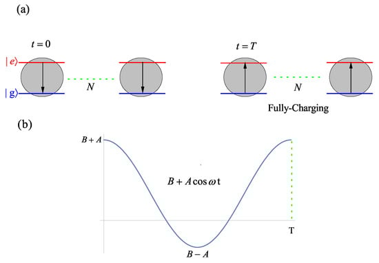 The complete quantum battery system is shown in Figure 1. It consists of an ensemble of independent two-level atoms. When , each atom is in the ground state . When , each atom is in the excited state and the quantum battery is fully charged, which can be seen in Figure 1a. We consider the quantum battery to be charged by a hybrid driving field , which can be seen in Figure 1b. The Hamiltonian of N non-interacting atoms can be written as []