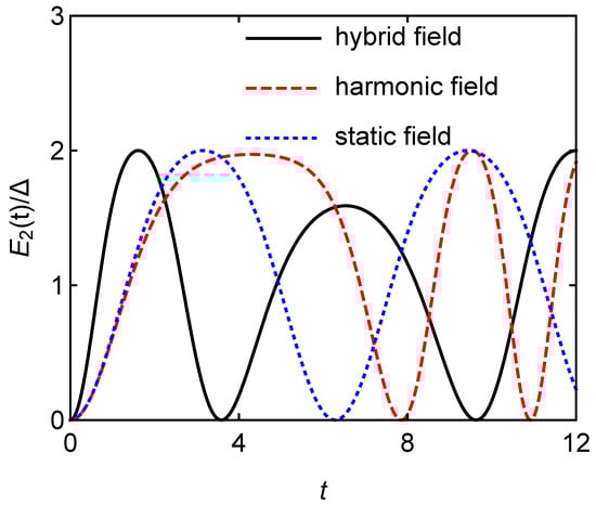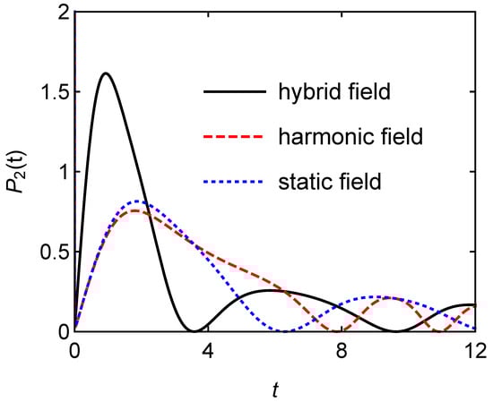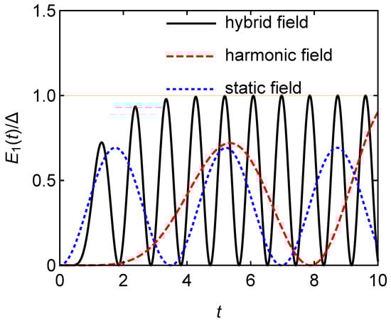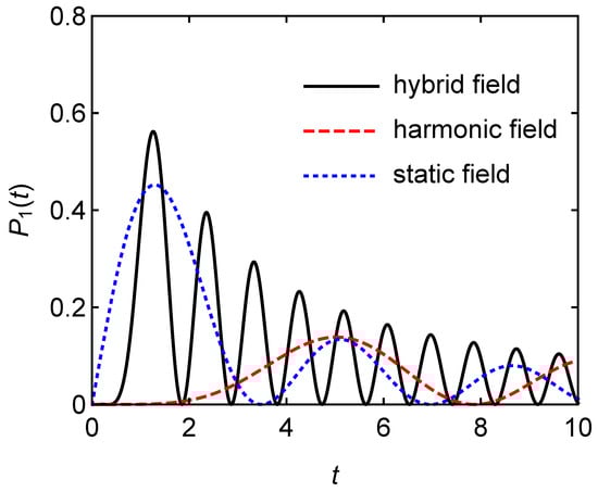 Recently, the experimental research of quantum battery has also made progress. The advantages and limitations of different profiles for classical drives used to charge these miniaturized batteries have been investigated []. The first experiment of charging and self discharging process of quantum battery was realized []. The charge and discharge of quantum battery also were realized experimentally []. Experimental investigation of a quantum battery was carried out by using star-topology NMR spin systems []. The concept of “super absorption” was successfully demonstrated in a new study []. This is the key idea supporting the quantum battery, marking that the quantum battery may become a reality. In the present scheme, one can control the opening time of harmonic field and static field so that they can be opened and closed at the same time to achieve the combined effect. For example, when the frequency modulated Raman laser beam and the static field drive the two-level system at the same time, the hybrid field charging is realized. Therefore, we think that it is feasible to combine the harmonic field with the static field to charge the quantum battery.