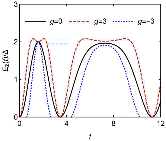 The relationship between stored energy and charging time t is shown in Figure 5. indicates that there is no interaction between atoms. It is clear that the repulsive interaction among the atoms () can improve the battery capacity, which is better than non-interacting atoms in terms of charging. For attractive interaction scenarios (), it has a negative influence on the energy storage of quantum battery. The stronger the repulsive interaction among the atoms, the more energy of the quantum battery can be stored. This is because the repulsive force among the atoms will increase the energy level spacing of atoms, so that quantum batteries can store more energy.