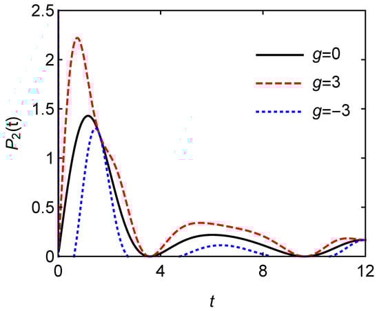 Figure 6 depicts the charging power versus charging time t for different g with . The repulsive interaction among the atoms significantly enhances the power of the quantum battery. The attractive interaction among the atoms will reduce the charging power. Figure 4 and Figure 5 show that the interaction among the atoms can significantly affect the performance of the quantum battery, especially the charging power. In the actual quantum battery, there are interactions among the atoms which should not be ignored. In the actual preparation of the quantum battery, the interaction among the atoms should be modulated into repulsive interaction as much as possible, which can improve the performance of the quantum battery.
