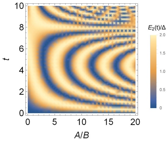 with . It can be seen from Figure 1a that the initial state of the system is . Therefore, we can express the initial state by the linear superposition of the system eigenstates as . At the end of the charging protocol, the final state of the one-atom battery is given explicitly by the eigenstates and eigenvalues
