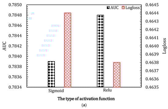 The activation function is the key part of the neural network. As shown in Figure 6, different activation functions have different effects on the two datasets. As shown in Figure 6a, the ReLU activation function performs better with the Criteo_600K dataset. However, as shown in Figure 6b, the sigmoid activation function performs better with the Criteo dataset. This indicates that different datasets have different characteristics and need to be fitted with different nonlinear activation functions.