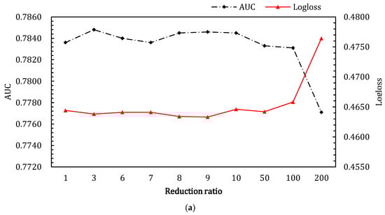 Effects of reduction ratio in SENet of ALN on the two datasets. (a,b) show the results for Criteo_600K dataset and Criteo dataset, respectively. (a) Effects of reduction ratio in SENet component of ALN on Criteo_600K dataset; (b) effects of reduction ratio in SENet component of ALN on Criteo dataset.
