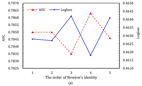 Performance comparison of order of ALIN on the two datasets. (a,b) show the results for Criteo_600K dataset and Criteo dataset, respectively. (a) Effects of order in Newton’s identity component of ALIN on Criteo_600K dataset; (b) effects of order in Newton’s identity component of ALIN on Criteo dataset.