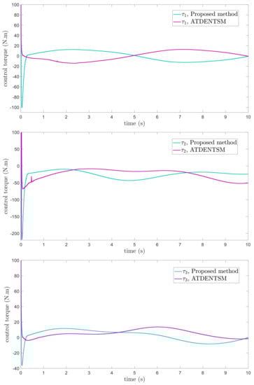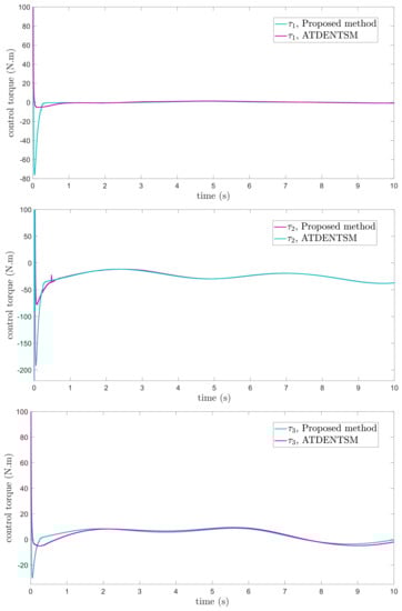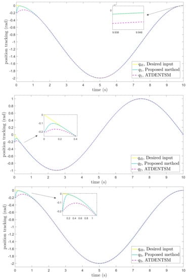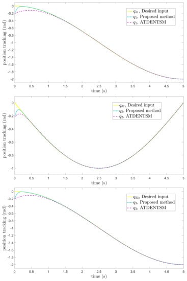 The comparative results of the proposed FoFxNTSM approach and ATDENTSM on robotic manipulators are depicted in Figure 3, Figure 4, Figure 5 and Figure 6, which show the joint’s position performance, its tracking errors, smooth control inputs, and sliding mode surfaces, respectively
