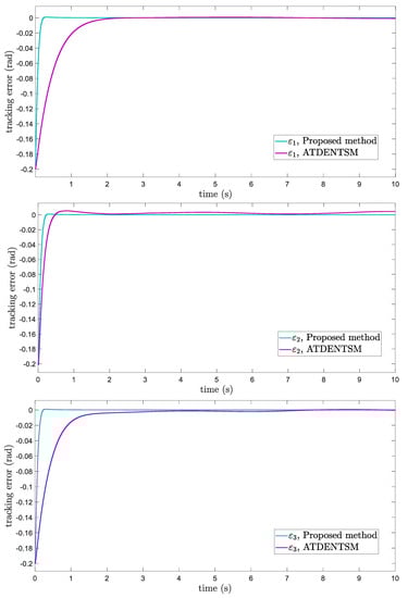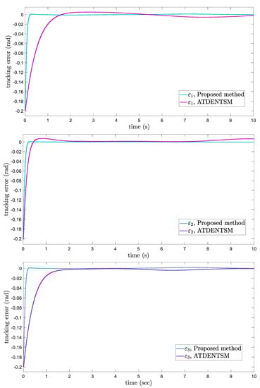 The findings that are compared and obtained reveal that the AFoFxNTSM has an improved tracking performance, chatter-free control inputs, and adaptive estimation in the presence of unknown uncertainties and external disturbances. Figure 7, Figure 8, Figure 9, Figure 10, Figure 11 and Figure 12 make it abundantly clear that the proposed method, when subjected to uncertainties and external disturbances, yields a superior convergence and trajectory tracking performance, whereas the ATDENTSM method demonstrates significant angular position errors and is less robust when exposed to unknown dynamics.
