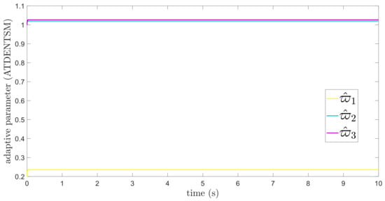 In this subsection, the proposed adaptive technique with the FoFxNTSM method is used to control the dynamics of the robotic manipulator in the presence of unknown uncertainties, as well as external disturbances. The parameters of (32) are set such that they are identical to those of (19), and the parameters of (34) are set such that , , and . Figure 7, Figure 8, Figure 9 and Figure 10 present the results of comparing the proposed AFoFxNTSM scheme with ATDENTSM in terms of its performance in the face of unknown dynamics, as well as benchmark simulations of trajectories, control inputs, and sliding surfaces. Moreover, the adaptive parameter estimations of the unknown dynamics of AFoFxNTSM and ATDENTSM are given in Figure 11 and Figure 12, respectively.