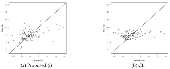 Table 5 shows the coefficient of determination using leave-one-out cross-validation (LOOCV) for Proposed (i) and CL. The fittings of the observed and predicted BMI are plotted in Figure 1a,b for Proposed (i) and CL, respectively. The horizontal axis represents the centered observed BMI values, and the vertical axis represents the corresponding predicted BMI. As shown, CL does not predict data with centered observed values between and as being in that interval, whereas Proposed (i) predicts these data correctly to some extent.
