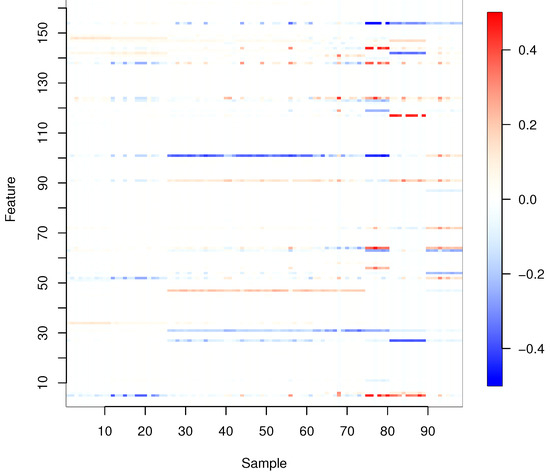 Figure 2 shows the regression coefficients estimated by Proposed (i) for all samples, where the regularization parameters are determined by LOOCV. To obtain the results in Figure 2, we used hierarchical clustering to group together similar regression coefficient vectors, setting the number of clusters as five.