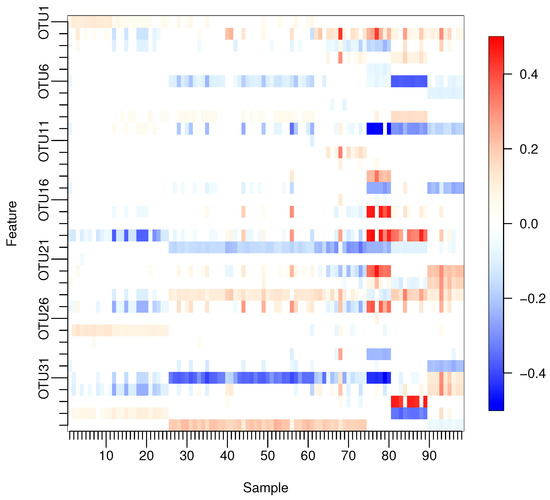 It is reported that the human gut microbiome can be classified into three clusters, called enterotypes, which are characterized by three predominant genera: Bacteroides, Prevotella, and Ruminococcus [11]. In the dataset, OTUs of genus levels Prevotella and Ruminococcus were aggregated into the OTUs of family levels Prevotellaceae and Ruminococcaceae by the single-linkage clustering. In Figure 3, Bacteroides correspond to OTU5, 6, 7, 8, 9, and 10; Prevotellaceae corresponds to OTU12; and Ruminococcaceae corresponds to OTU30 and 31. For these OTUs, the differences are clear between OTU6, 9, 10 and OTU30, 31 among samples 81–90, in which only Bacteroides are correlated to the response. On the other hand, the differences among samples 65–74 are also indicated, in which only Bacteroides do not affect BMI. These results suggest that Bacteroides, Prevotellaceae, and Ruminococcaceae may have different effects on BMI that are associated with enterotypes. In addition, it is reported that women with a higher abundance of Prevotellaceae are more obese [28]. The regression coefficients of non-zero Prevotellaceae are all positive, and the eight corresponding samples are all females. On the other hand, in OTU29 indicating Roseburia, 9 samples out of 10 are negatively associated with BMI. Roseburia is also reported to be negatively correlated with indicators of body weight [29].