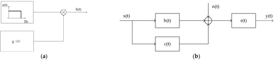 The model for the random target is given in Figure 1 [10]. Figure 1a shows the implementation process of a random target, where represents a generalized stationary random process and denotes a rectangular window function with duration Th. Therefore, the product represents a valued local stationary random process within [0, Th]. Figure 1b depicts the signal model for transmitted waveform design based on SINR and MI, where denotes the transmitted waveform signal and represents a finite-duration random process, and and denote the Fourier transforms of and , respectively. represents the impulse response of the receiver filter, and n(t) is a zero-mean channel noise process with the power spectrum density (PSD) . Likewise, represents an interference signal which is a zero-mean Gauss stochastic random process with the PSD .