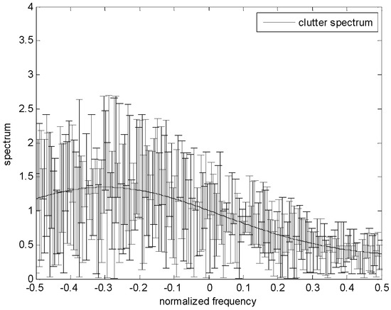 The uncertain ranges of the target spectrum and clutter spectrum are shown in Figure 3 and Figure 4, respectively. The precise target spectrum and clutter spectrum, which cannot be obtained by the radar system in an actual scene, are represented by solid lines. The upper and lower bounds at each sampling are represented by the deviation bounds. The upper bound is the precise target spectrum or clutter spectrum plus a random value. Similarly, the lower bound is the precise target spectrum or clutter spectrum minus a random value. The main simulation parameters are shown in Table 1.