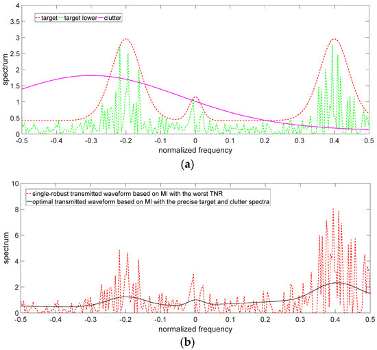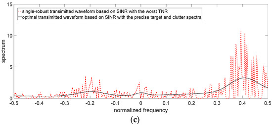 Figure 5 depicts the results of the single-robust transmitted waveforms (SRWs) based on MI and SINR criteria when the target spectrum is uncertain. The SRWs in the case of the worst TNR have the following characteristics: