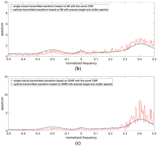Single-robust waveforms with the uncertain clutter spectrum. (a) Target and clutter spectra in the case of the worst CNR. (b) Single-robust transmitted waveform based on MI. (c) Single-robust transmitted waveform based on SINR.
