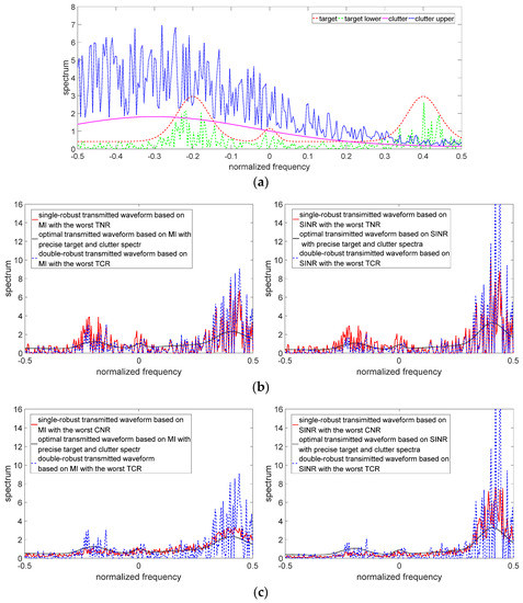 Single-robust waveforms with the uncertain target spectrum. (a) Target and clutter spectra in the case of the worst TNR. (b) Single-robust transmitted waveform based on MI. (c) Single-robust transmitted waveform based on SINR.
