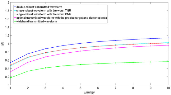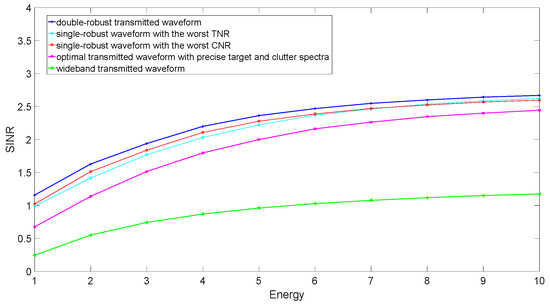 Assume that the total energy of the transmitted waveform increases from 1 to 10 J. The MIs and SINRs corresponding to the several transmitted waveforms are compared in the case of the worst TCR in Figure 8 and Figure 9, respectively. The wideband waveform is used as a benchmark, which allocates the transmitted energy uniformly across the whole frequency band. The wideband waveform has the worst MI and SINR because of a lack of information about target and clutter. OTWs perform better than wideband waveform, because OTWs allocate energy according to precise information about the target and clutter, although this information is not captured in an actual scene. The SRWs have better MI and SINR than the OTWs, because they can use the lower bound of the uncertain target spectrum or the upper bound of the uncertain clutter spectrum in the case of the worst TCR. The best MI and SINR can be obtained when utilizing the DRWs in the case of the worst TCR. That is due to the fact that the uncertain target and clutter spectra in an actual scene are considered in the double-robust waveform design scheme.