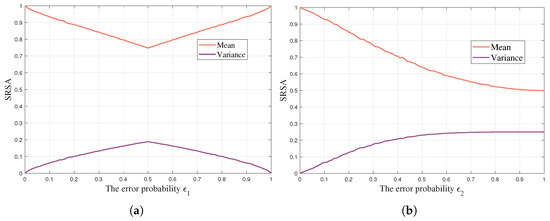 The simulation results of SRSA with the number of runs. We divide it into four cases. Case I: , and ; II: (with an error probability of 0.5), and ; III: , (with an error probability of 0.5) and ; IV: , and . (a) The mean of SRSA. (b) The variance of SRSA.