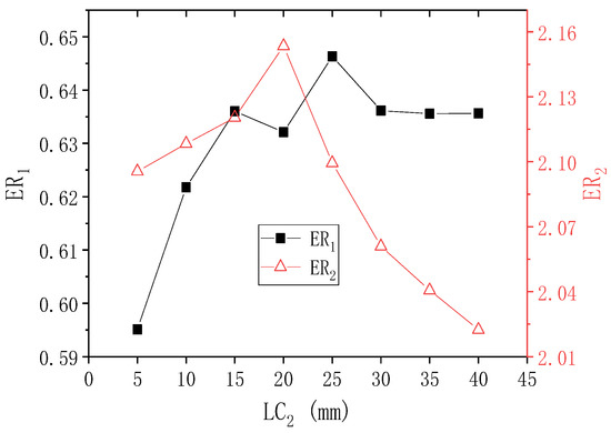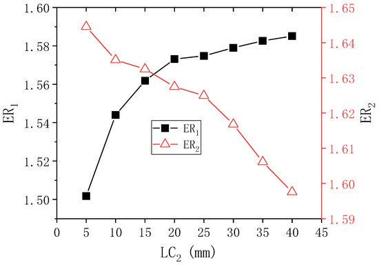 Figure 11 presents the results of ER1 and ER2 with LC2 when PNTD2 is 5.3 mm. As illustrated in the figure, when LC2 changes from 5 mm to 40 mm, ER1 increases from 1.502 to the maximum value 1.585. ER2 decreases from 1.645 to a minimum of 1.598. Compared with the initial values of ER1 and ER2 (1.573 and 1.627), the maximum values of ER1 and ER2 increase by 0.012 and 0.018. In addition, when LC2 changes from 5 mm to 40 mm, the maximum deviations of ER1 and ER2 are 5.526% and 2.941%, respectively, which means that the performance of both stages is affected by the change of LC2, and the performance of the first-stage is slightly more affected. In contrast, when LC2 is 15–25 mm, the values of ER1 and ER2 are at large values.