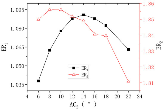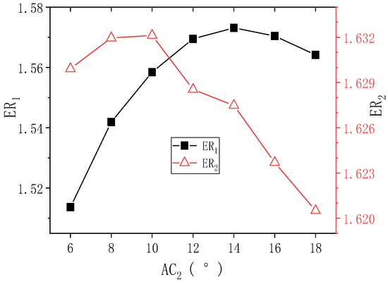 Figure 10 indicates the results of ER1 and ER2 with AC2 when PNTD2 is 4.7 mm. As shown in the figure, with the increase of AC2, ER1 increases first and then decreases, and the highest value of ER1 is 1.091 (AC2 = 14°). With the increase of AC2 from 6° to 8°, ER2 increases from 1.849 to 1.856; and with the increase of AC2 to 22°, ER2 decreases to 1.811. The maximum deviations of ER1 and ER2 are 5.106% and 2.485%, respectively, which means that AC2 has an impact on the performance of both stages, but ER1 is more sensitive to the change of AC2. In addition, the range of AC2 where both ER1 and ER2 are at large values is still within 10°–14°.