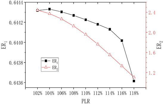 When PNTD2 = 4.7 mm, the influence of changing PLR on ER1 and ER2 is shown in Figure 14. ER1 is almost unaffected by PLR, with the highest and lowest values of 1.092 and 1.090, respectively. In addition, when PLR increases from 102% to 104%, ER2 remains at 1.938; when PLR increases from 104% to 118%, ER2 decreases to the minimum value of 1.253, and the maximum deviation of ER2 is 54.7%. Therefore, the change of PLR has a relatively obvious impact on ER2. Moreover, it can be seen that compared with the ER value of PNTD2 = 4.1 mm, ER1 increases a lot, while ER2 decreases a little.