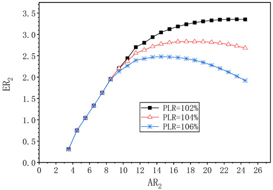 The effect of AR2 at PNTD2 = 4.1 mm on ER2 at different PLR is shown in Figure 16. It can be seen that the change trend of ER2 affected by AR2 under the three PLR is consistent, that is, ER2 first increases, and then decreases as AR2 increases. At PLR = 102%, ER2 reaches its maximum value of 3.354 at AR2 = 23.5, so the best value for AR2 is 23.5, which is 13.0 times more than the optimal value of AR2 at PLR = 108%, and ER2 increases by 37.3% compared to the optimal value of 2.442 at PLR = 108%. When PLR is 104%, ER2 reaches a maximum value of 2.682 at AR2 = 17.5, then the optimal value of AR2 is 17.5, which is 7.0 times greater than the optimal value of AR2 at PLR = 108%; the optimal value of ER2 increases by 13.1% compared to the optimal value of 2.372 for ER2 at PLR = 108%. At PLR = 106%, the optimal value of 2.480 for ER2 is obtained at AR2 = 14.5, so that the optimal value for AR2 is 14.5, which is 4.0 times greater than the optimal value for AR2 at PLR = 108%, and the optimal ER2 increases by 9.4% over the optimal value for ER2 (2.266) at PLR = 108%. In summary, with the PLR increasing from 102% to 108%, the maximum ER2 decreases from 3.354 to 2.266, and the corresponding optimal AR2 decreases from 23.5 to 10.5.